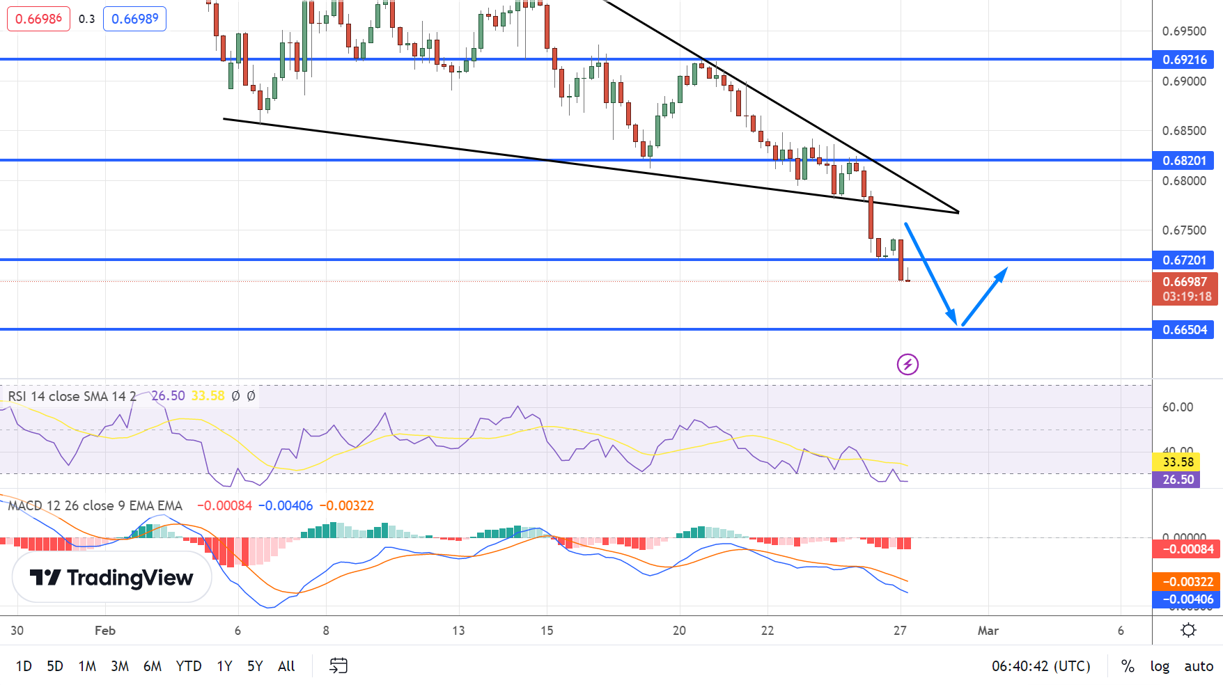 Both the RSI and MACD indicators support a downtrend as they are holding under 50 and 0, respectively. On the other hand, the AUD/USD's resistance levels are currently at $0.6745 or $0.6780.