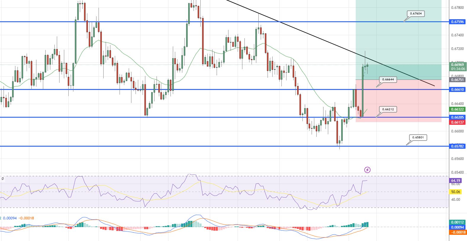 In reaction to the recent hawkish move of the Australian central bank, the AUD/USD pair has risen by approximately 60 points, reaching 0.6684. This marks the third consecutive trading day that the pair has traded higher.