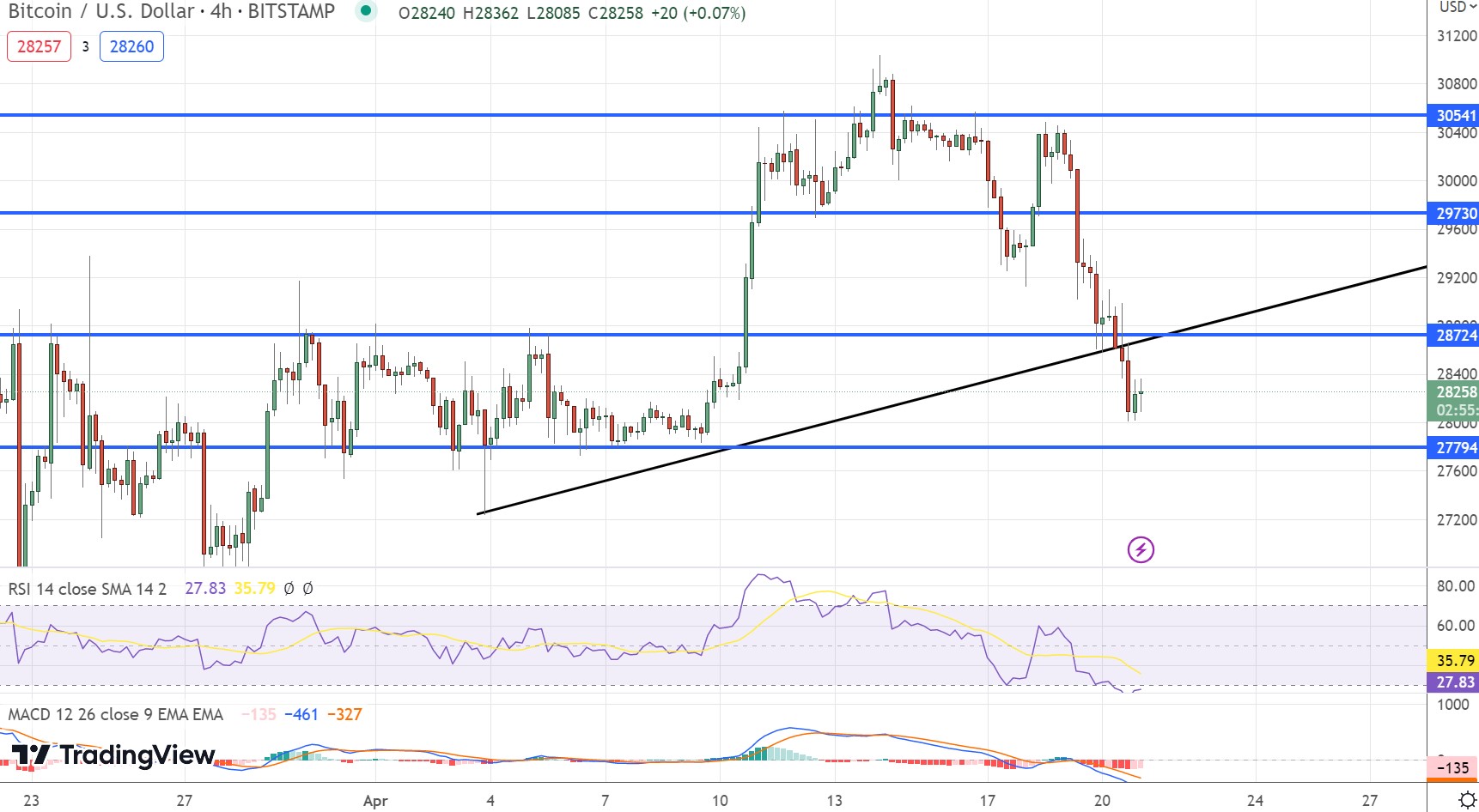* Bears push price towards $28,000 support, with Bitcoin consolidating losses.