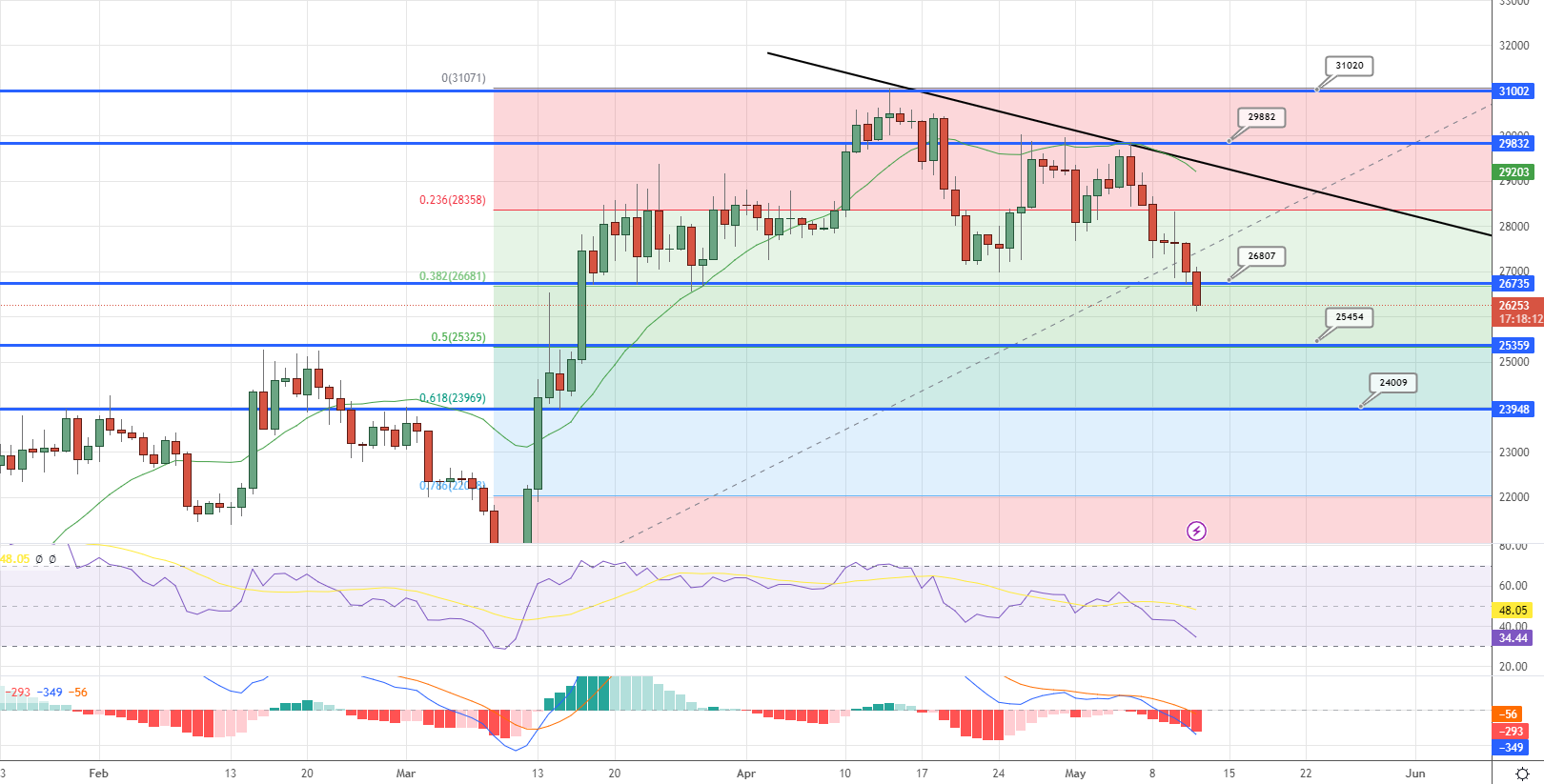 * The next support level at $25,450, corresponding to the 50% Fibonacci retracement mark, could be the target if the bearish trend continues.