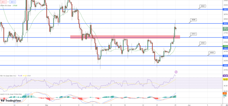 - A successful breach and close above $28,300 might motivate investors to go long, aiming for resistance levels at $29,000 and potentially $29,450.