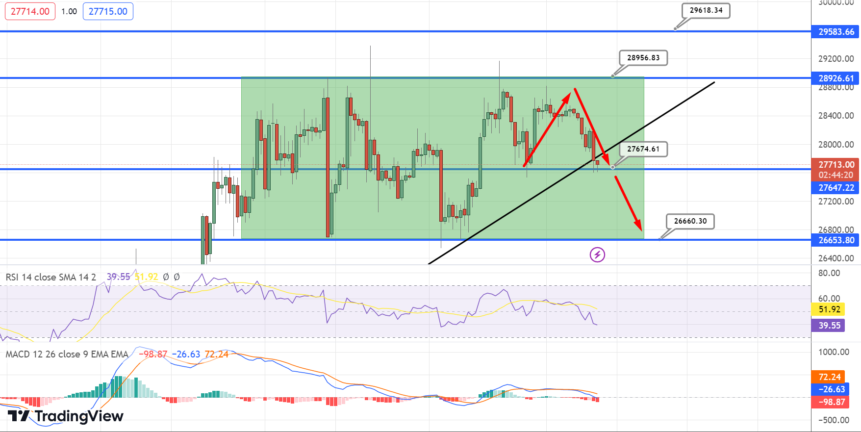 Immediate resistance lies around $27,820, which is close to the 23.6% Fibonacci retracement level of the downward move from the $28,595 swing high to the $27,578 low.