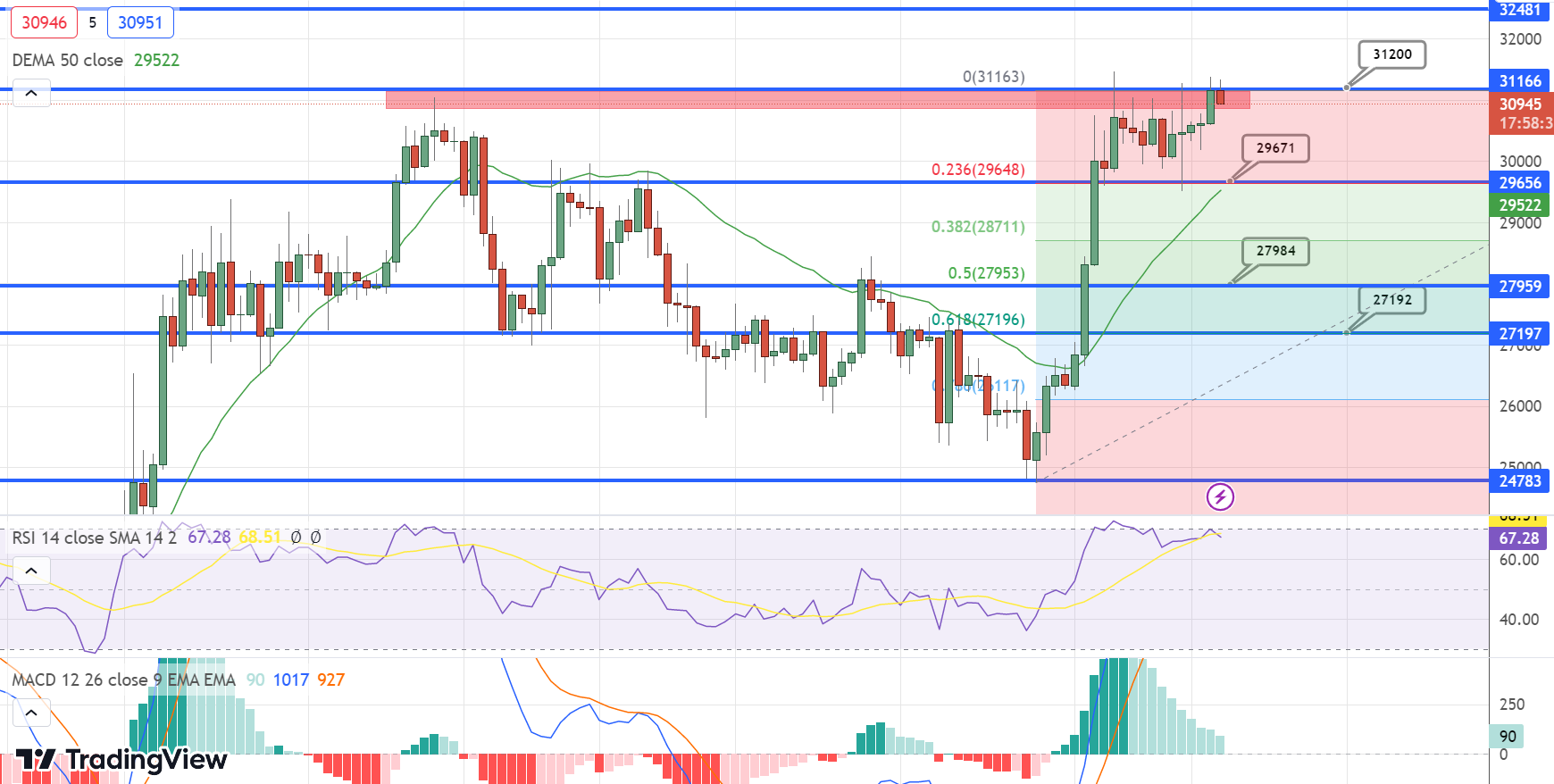 In terms of resistance, the immediate level to watch is around $31,350, followed by the major barrier at $31,400. A successful breakthrough above this level could trigger another strong upward move, potentially pushing the price towards the next significant resistance at $32,000.