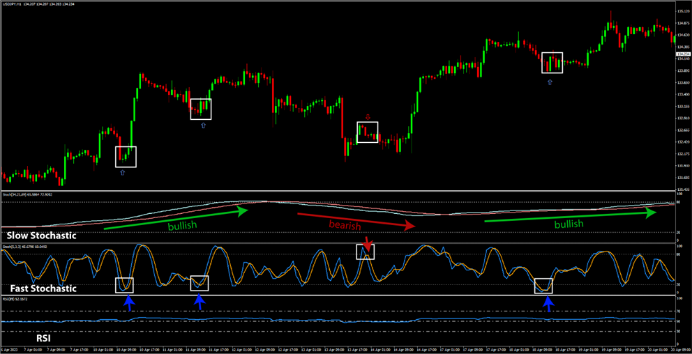 We add the RSI under the two Stochastic oscillators as an additional filter layer. The purpose of the RSI is to provide additional confirmation of the trend momentum. Thus, we look for the RSI to be above 50 in bullish setups and below 50 in bearish setups.