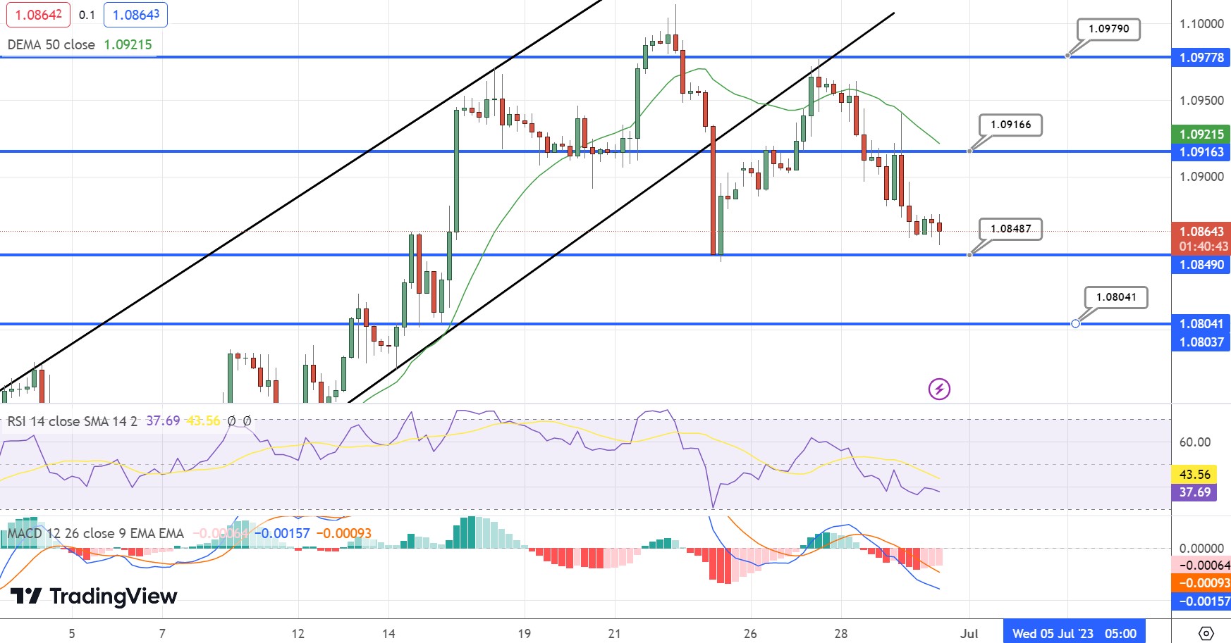 Prepare for an engaging trading session today, as the anticipated trading range lies between the reliable support level of 1.0790 and the formidable resistance level of 1.0930. The prevailing trend for today remains bearish, emphasizing the potential for continued downside movement.