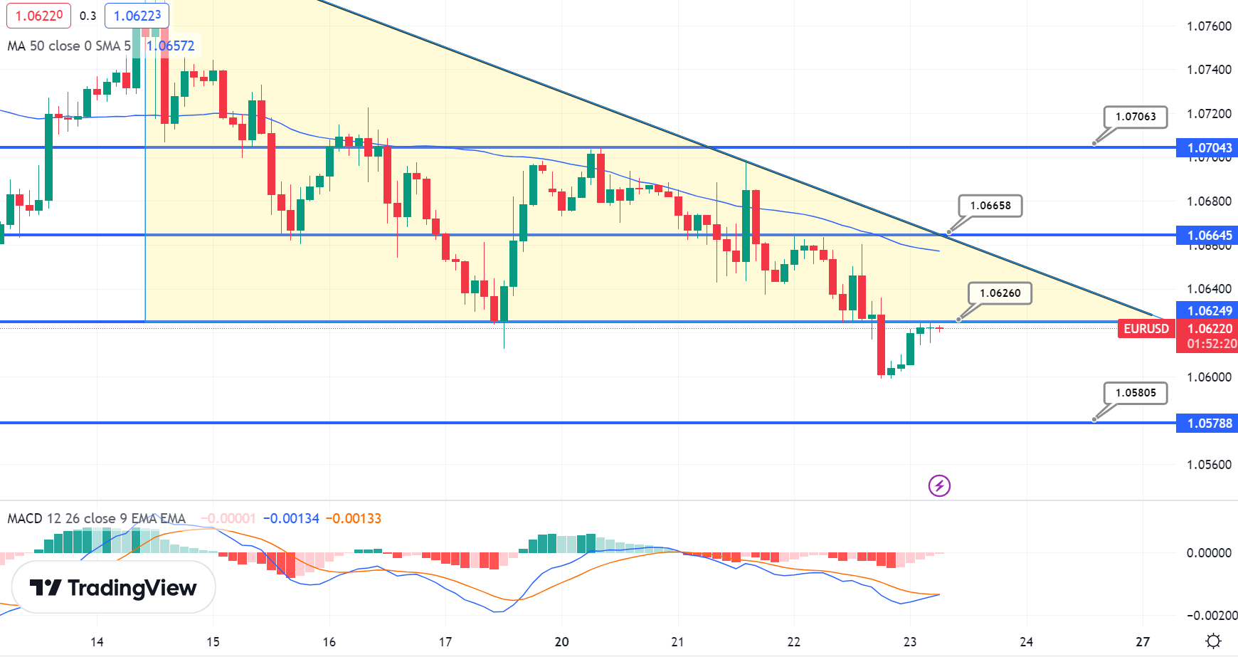 The RSI and MACD indicators are still indicating a downtrend, along with the 50-day simple moving average holding around the $1.06560 level.