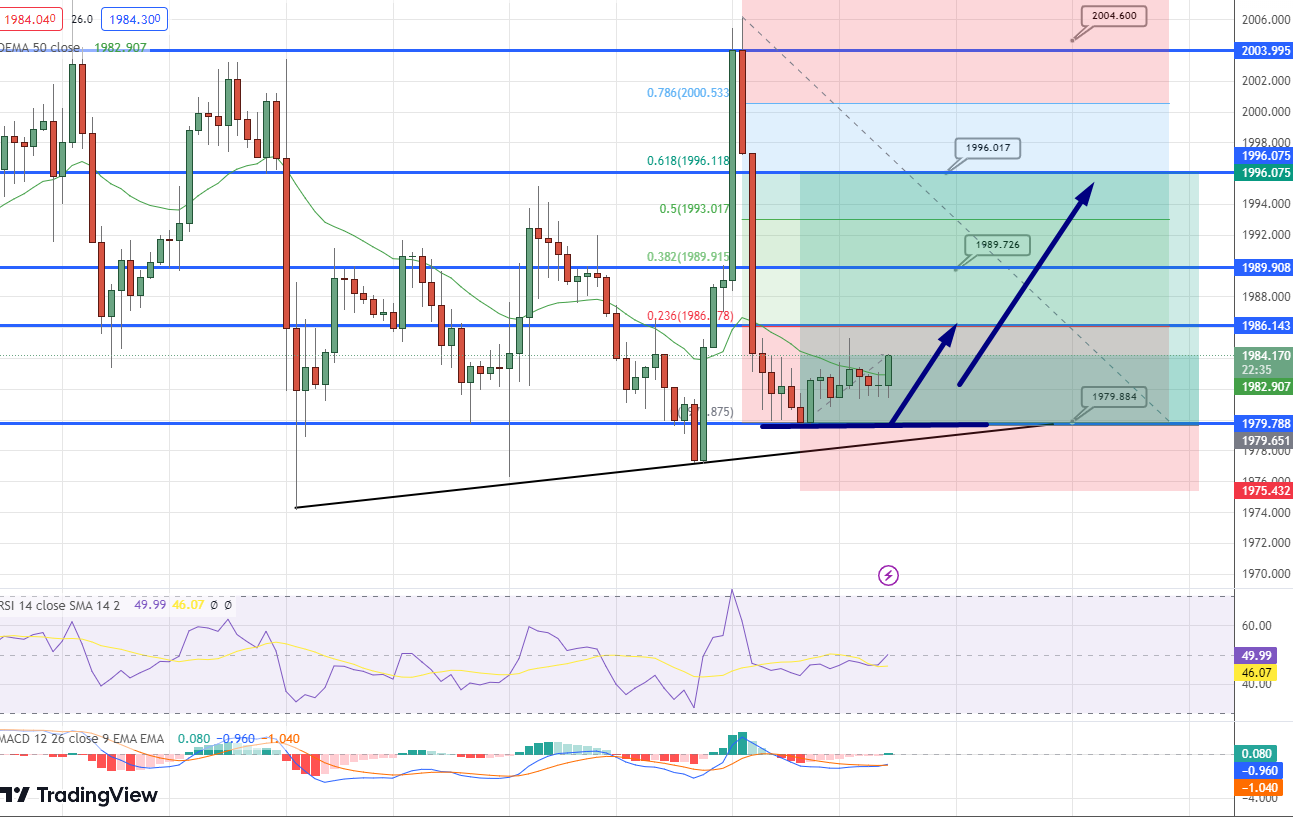 * A bullish break above $1986 may lead to a target of $1989 (38.2% Fibonacci retracement), with a further break possibly reaching $1996.