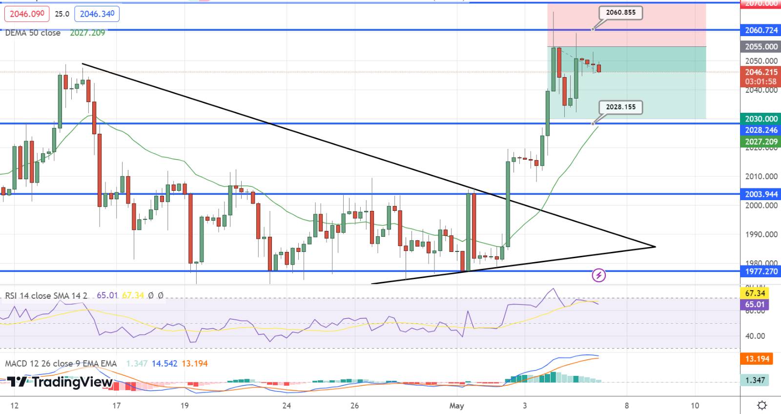 The current gold price is attempting to surpass the major resistance level of $2,048.70, but it has been facing difficulty in maintaining a steady position above it.