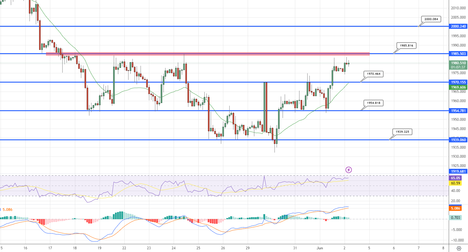 - Immediate resistance is expected around $1,985, with potential targets at $1,990 and $2,000.