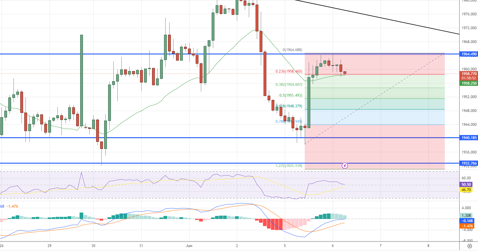 - If the price breaks below $1958, it could find further support at $1954 and $1951, corresponding to the 38.2% and 50% Fibonacci retracement levels.