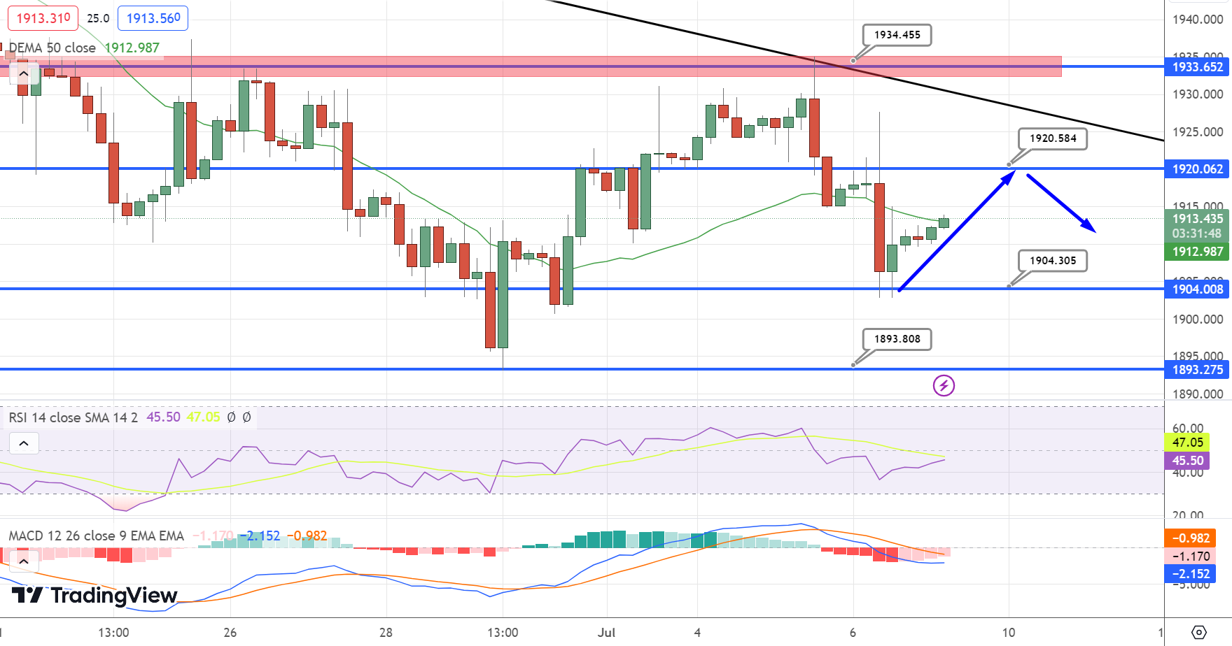 For today's trading, we anticipate the price to move within a range of support at $1890.00 and resistance at $1925.00.