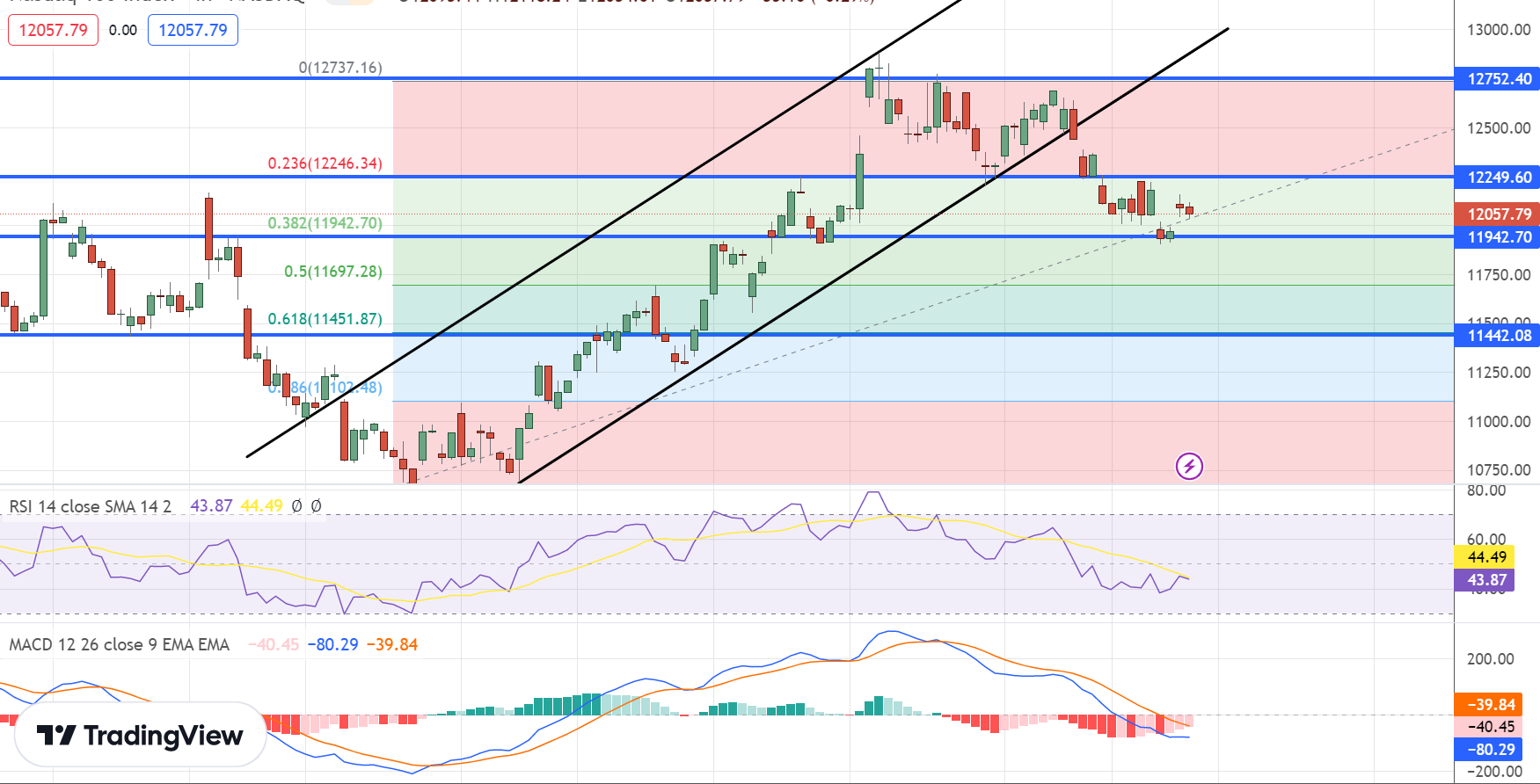 From a technical perspective, the NASDAQ has completed a 38.2% Fibonacci retracement and is now finding support at the $11,940 level. A close below this level could expose the NASDAQ price to the next support level at around $11,440.