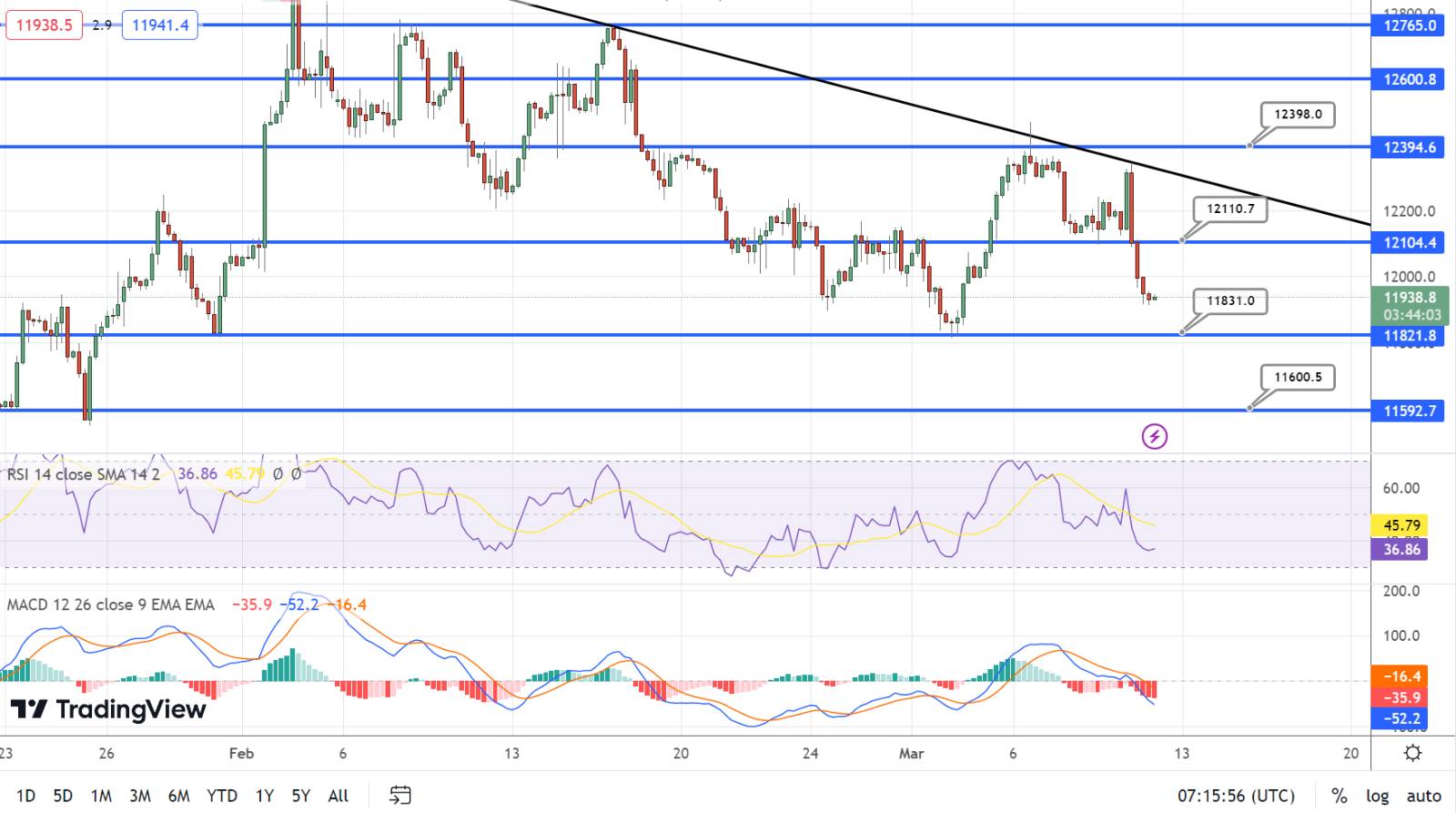 The MACD and RSI indicators are both in the selling zone, indicating a strong bearish bias in the market. However, on the upside, if the NASDAQ manages to cross over the $12,100 level, it could potentially reach the $12,400 or $12,600 mark.