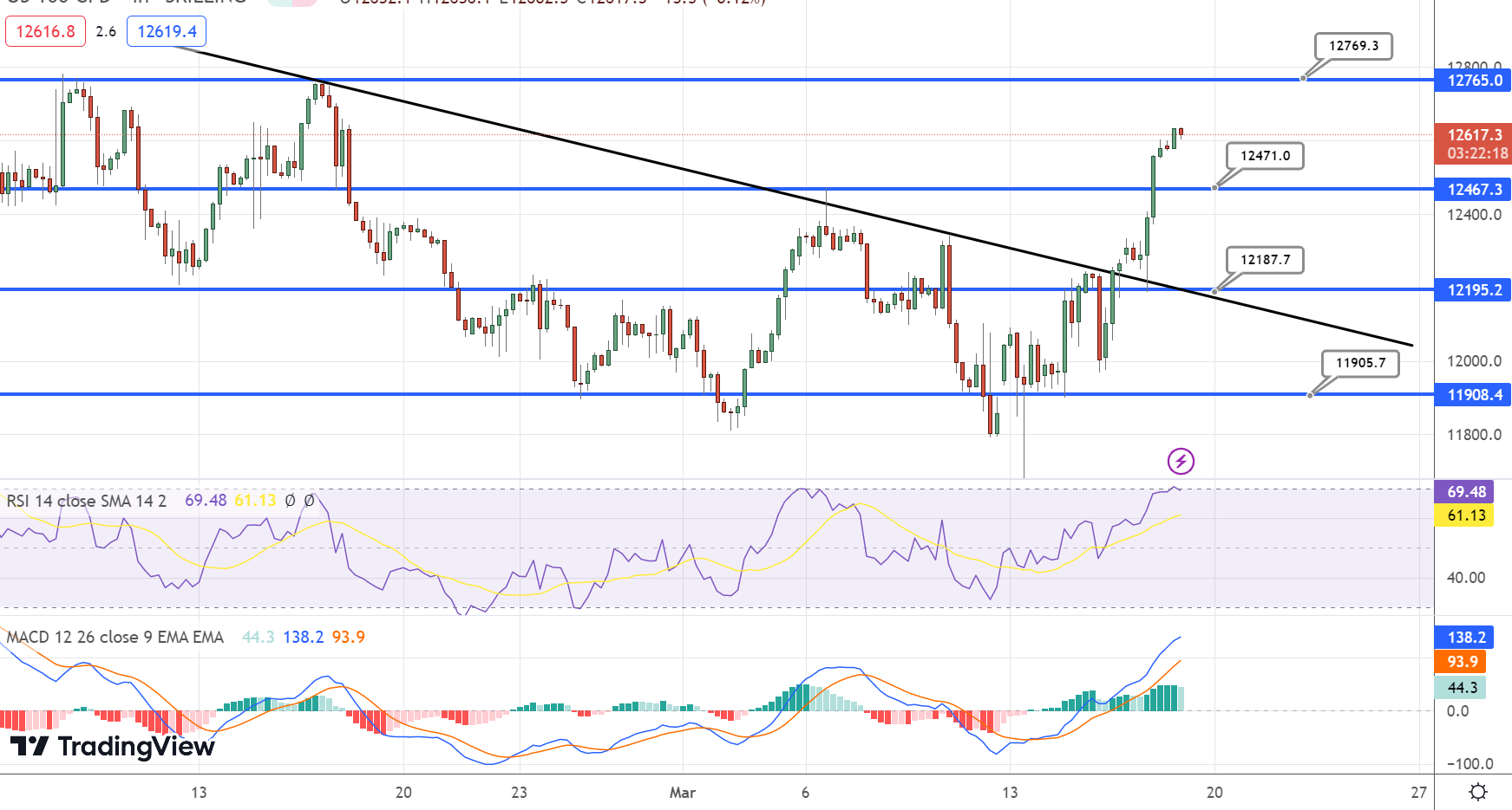 The Nasdaq 100 Index is currently trading at 12,581.39, which is an increase of 2.69% in the last 24 hours. Stocks are rising as investors anticipate that the authorities will provide sufficient support to the banking system.
