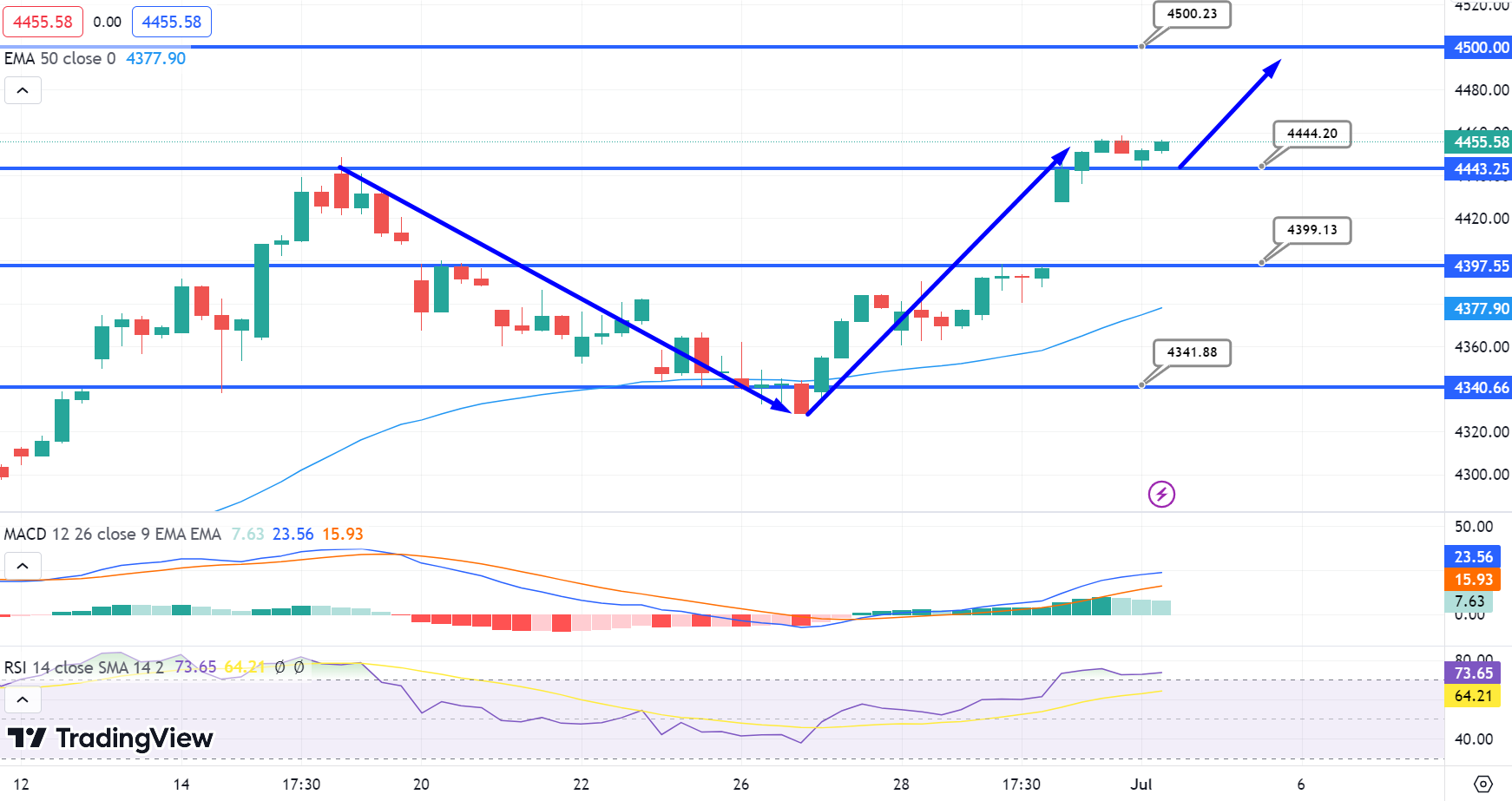 - Next resistance levels to watch are at 4,511 and 4,525, while a breach of the support at 4,440 could lead to a significant downward move with support expected around 4,395.