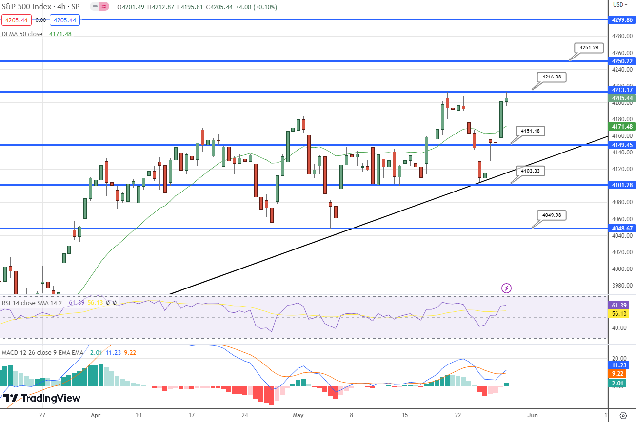 Below this level, we can expect a bearish sentiment, while above it, a bullish sentiment may prevail. A break above the 4215 level could expose the S&P 500 to higher levels such as 4250 or even 4299. On the downside, key support levels are likely to be found around 4150 and 4103.