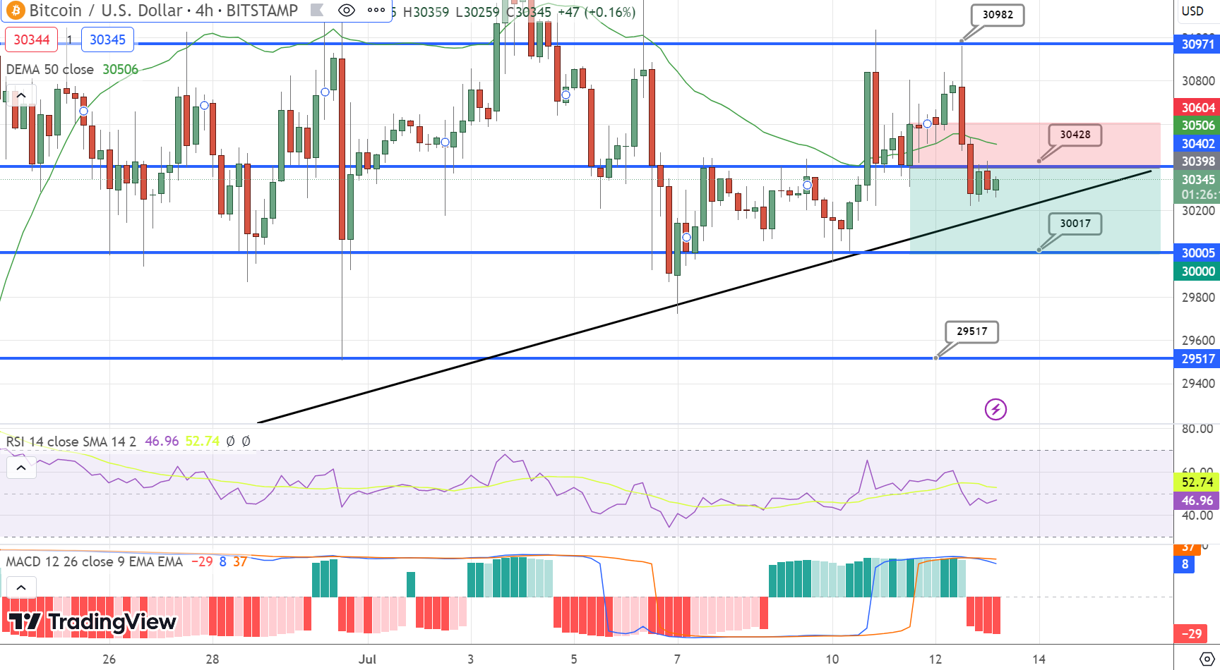 Additional declines could drive the price towards the support zone of $29,850, and potentially even lower towards $29,400.