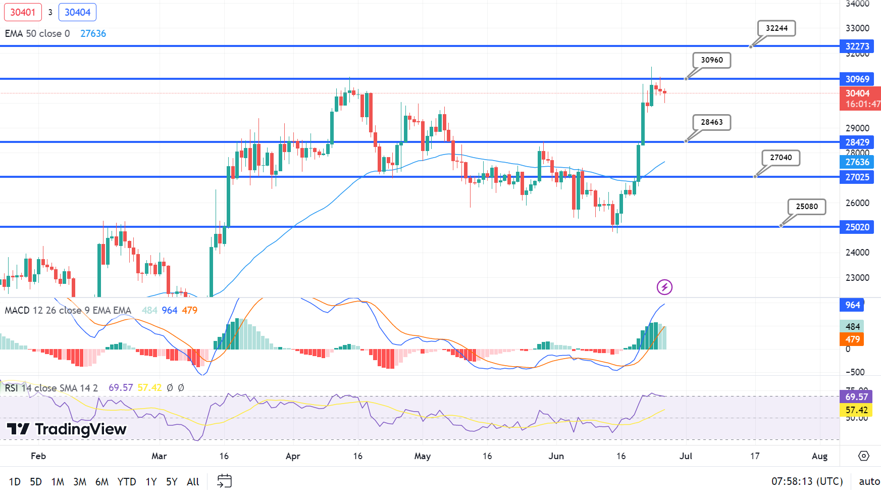 It’s like finding the perfect pit stop coinciding with the 50-day exponential moving average. And if the action gets really intense, the next support around $26,750 will come to the rescue!