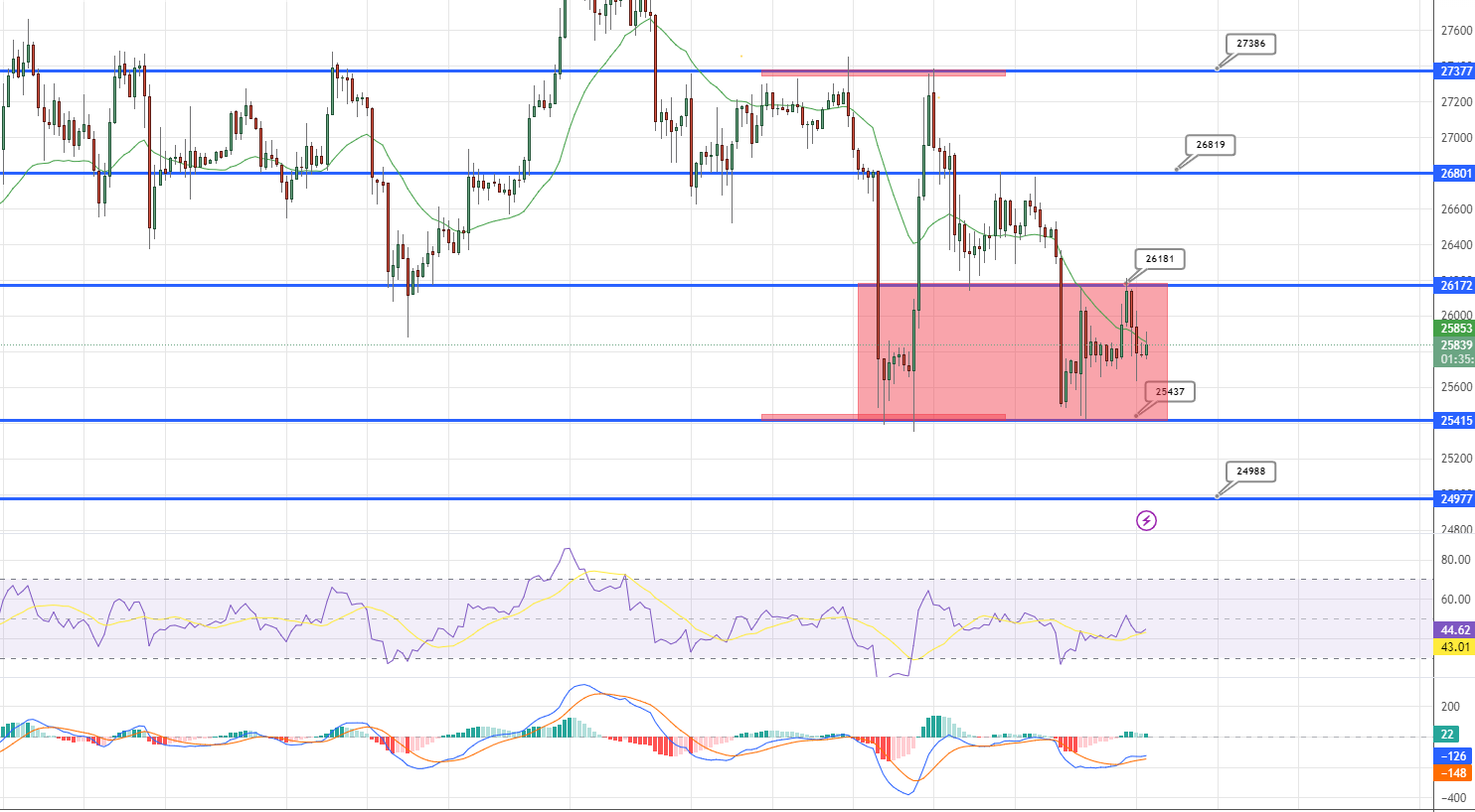 - Monitoring $25,600 level crucial; RSI and MACD showing mixed signals