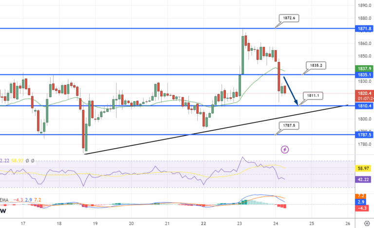 Downside potential indicates a possible target of $1,810, with the hourly trendline extending to the psychological level of $1,800. The Relative Strength Index (RSI) and Moving Average Convergence Divergence (MACD) are currently in the bearish zone, with RSI below 50 and MACD below zero, reflecting a bearish sentiment.