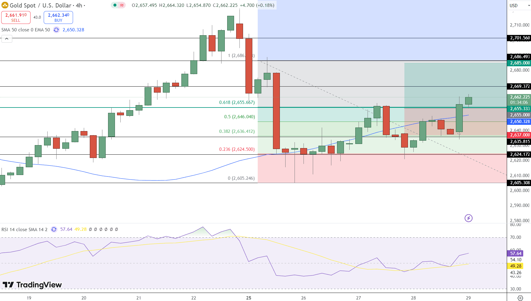The RSI stands at 57, reflecting moderate bullish momentum without entering overbought territory. This leaves room for further gains if buyers maintain control. Gold's movement above the $2,655.33 pivot point confirms a bullish bias, supported by strong technical structure.