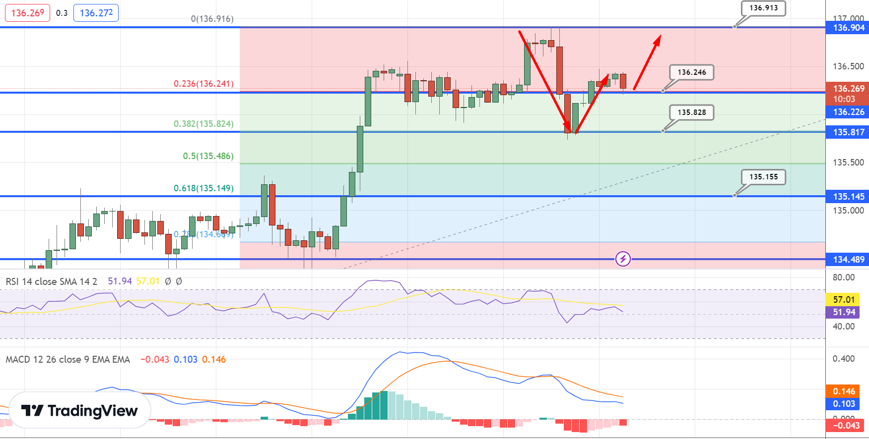The USD/JPY pair is currently receiving immediate support at the 135.500 level and is gaining further support near the 134.150 level. If it breaks below this level, the next support area is around 134.450, which acted as support on February 23, 2023.