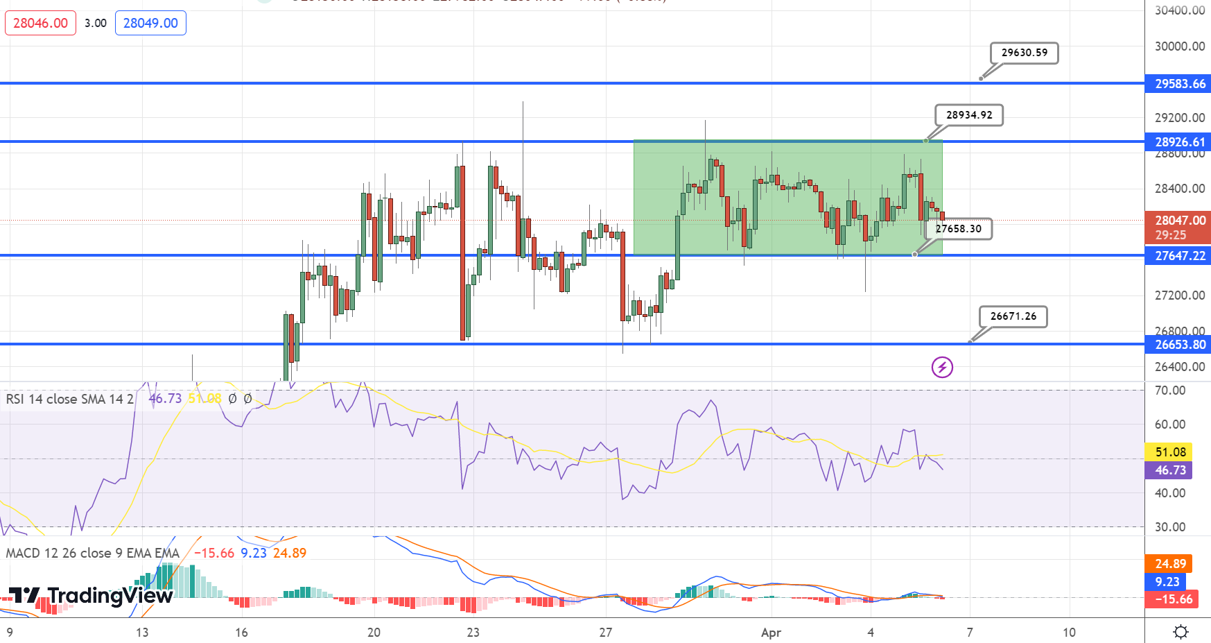 The price fell below $28,400 and $28,200 levels as bears pushed it below the $28,000 support. It reached a low of $27,813 before bulls stepped in. Bitcoin's price is currently consolidating above the recent low and trading close to $28,000.