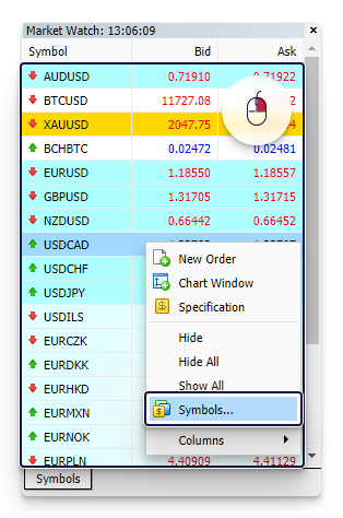 Right clicking on the instrument within the ‘Market Watch’