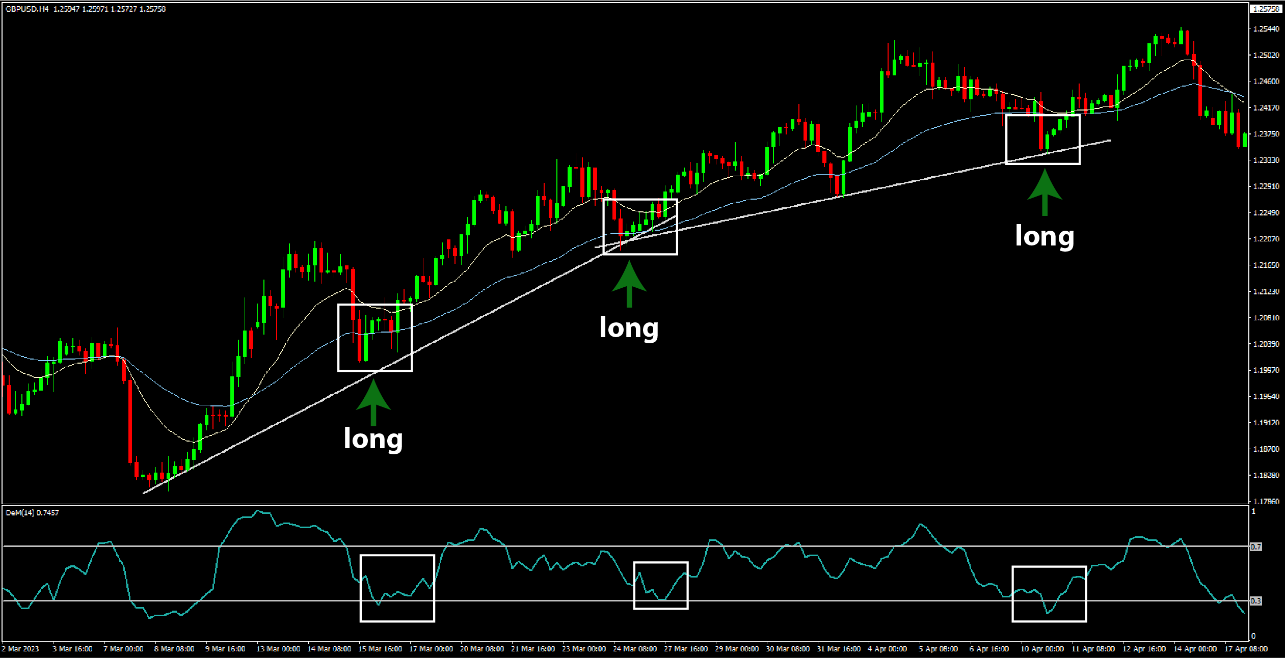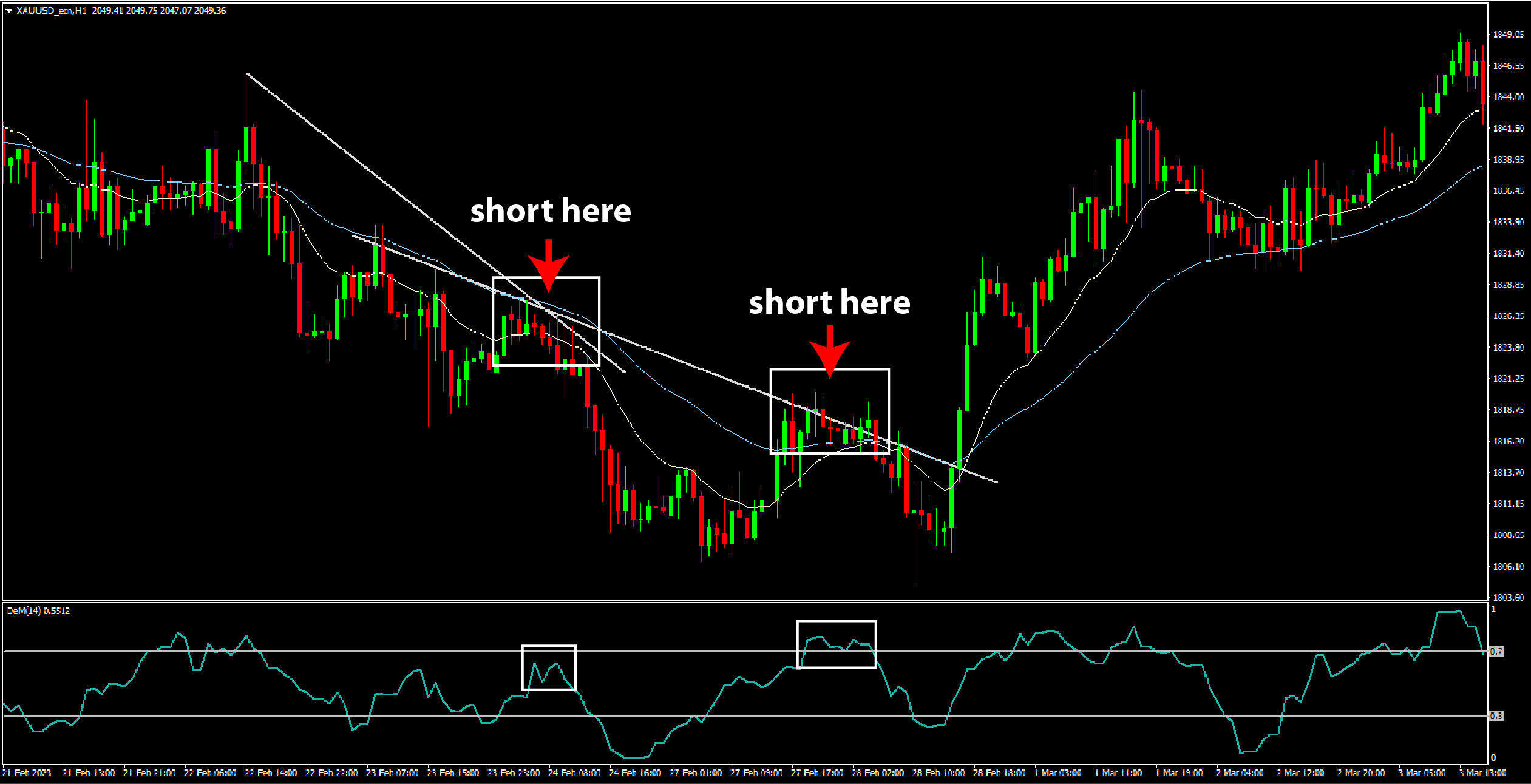 A buy or sell signal is generated when the trendline is confirmed. In the case of bullish setups, the price should bounce at the trendline when the DeMarker is around 0.3. For bearish setups, look for a rejection at the trendline and a reading of around 0.7 on the DeMarker oscillator.