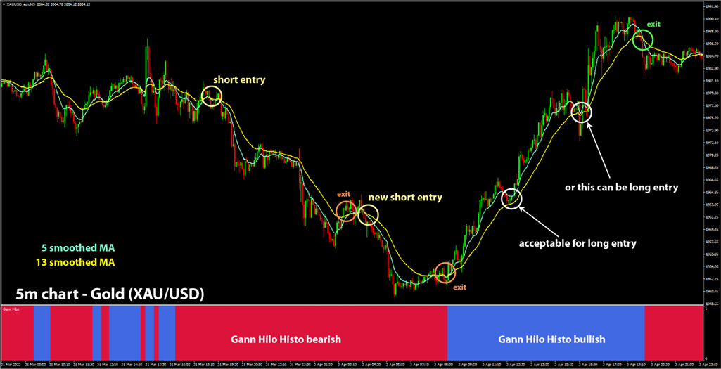 Then we use two smoothed moving averages – 5-period and 13-period – to give our entries and exits. Basically, we look for the moving averages to make a crossover in the same trend direction that the Gann Hilo Histo indicator is already showing. This is the 2nd condition.