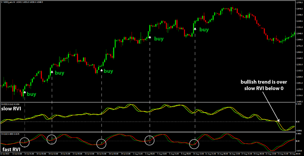 So, a trend is considered bullish when the 55-period RVI has made a bullish crossover and is above the 0 line. Conversely, the trend is bearish when the RVI lines have bearishly crossed over, and the RVI value is below the 0 line.