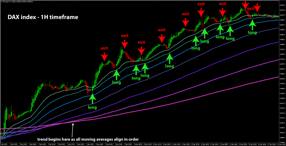 As you can notice, the moving averages range from very short-term to very long-term. So, with this strategy, we don’t look to catch either the short-term or long-term trends but rather look to trade only on the side of the confirmed predominant market direction.