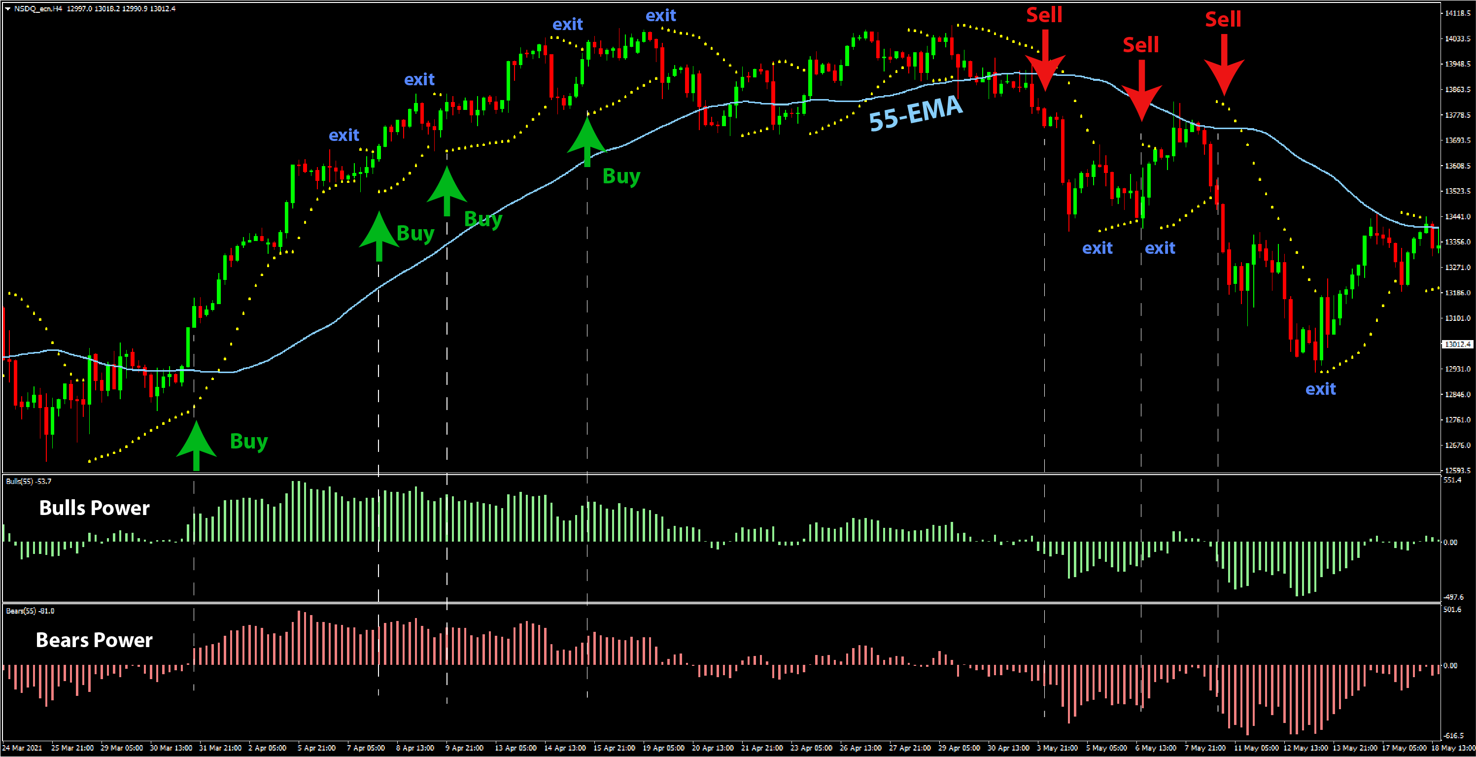 You will notice that most of the time, the Bulls Power and Bears Power indicators will confirm the same trend as the EMA. But not always. In some instances, one of them will switch the trend while the other will remain unchanged. This is an indication that the trend change is potentially fake. Wait for both the Bears and Bulls Power indicators to switch the trend.
