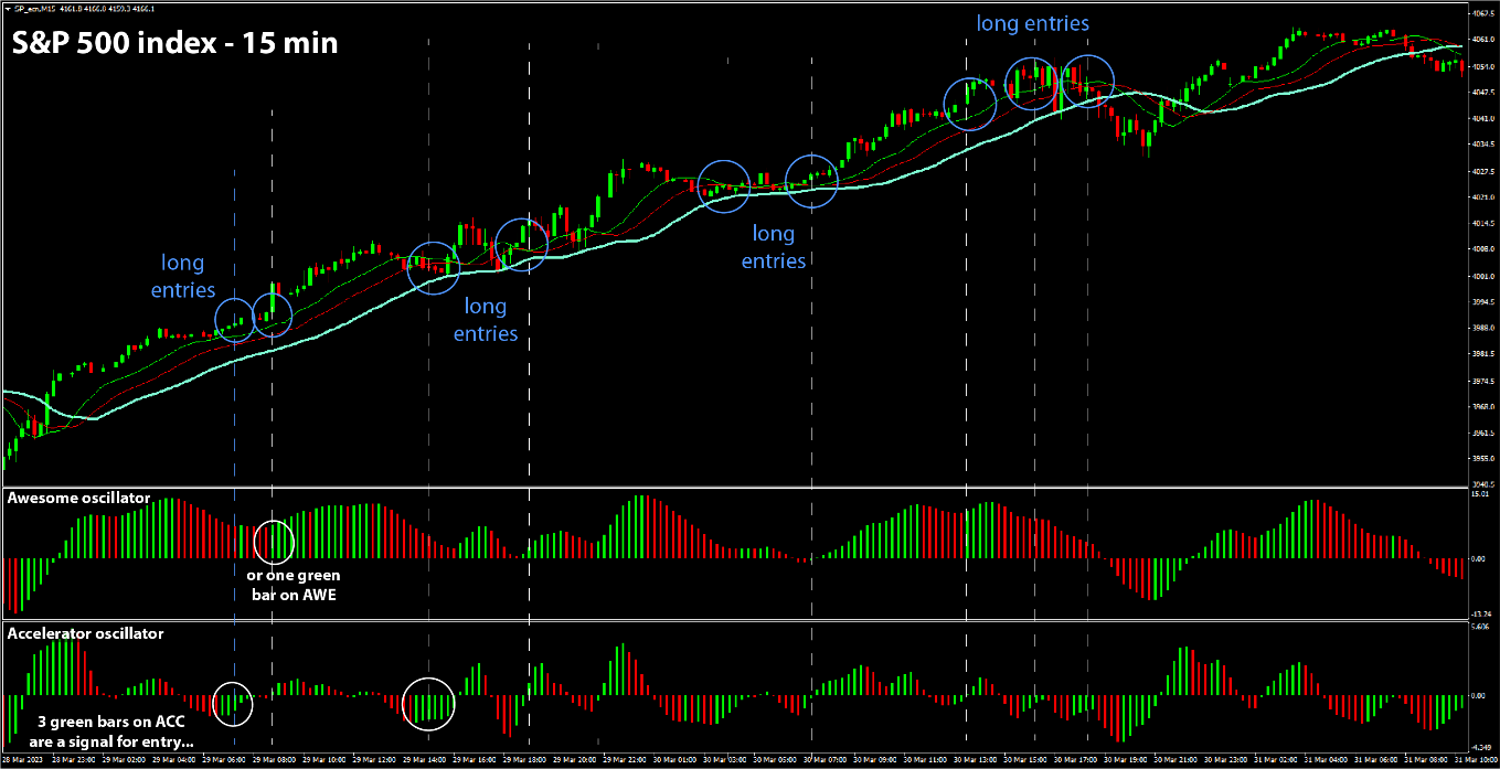 9. When the price is near the turquoise of the Alligator, we use the Awesome and Accelerator oscillators to give the entry signal. In a bull trend, the Awesome oscillator should print a green bar. The Accelerator oscillator gives earlier signals. It will tend to print green bars before the Awesome oscillator does. In most cases, it’s best to have both oscillators print a green bar. This is the optimal signal for an entry.