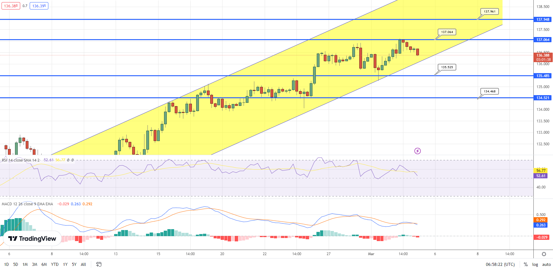 A break below this level could end the positive scenario and push the price down to test the 133.30 regions. The trading range for today is expected to be between 135.60 support and 137.30 resistance.