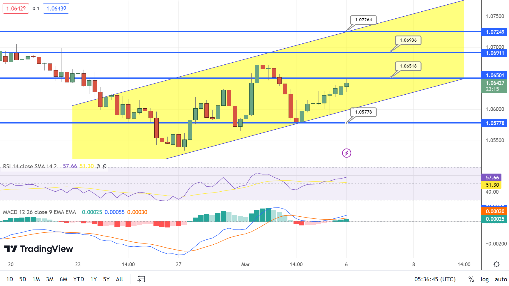 The EUR/USD pair is currently trading at 1.0644. It closed the previous week on a bullish note, providing a positive outlook for traders who are bullish on the pair. Last week, there were positive inflation indicators in the Eurozone, including the CPI and the Harmonized Index of Consumer Prices (HICP), which supported the hawkish stance of the European Central Bank (ECB).
