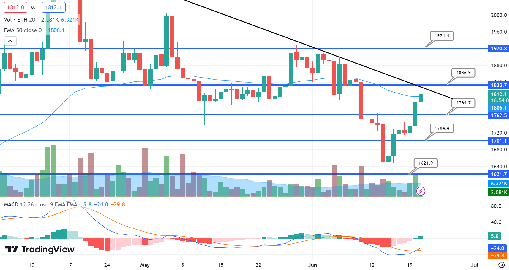 Ethereum recently broke through the triple top pattern at $1,775, indicating a bullish surge towards the next resistance level at $1,841. The presence of a descending trend line on the four-hourly timeframe adds weight to this resistance level.