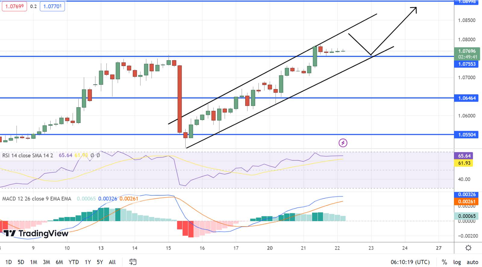 The EUR/USD currency pair is currently trading at around 1.0770. Following a four-day increase, the pair has stabilized as buyers take a breather at the highest levels seen in five weeks on the day of the Federal Reserve (Fed) decision.