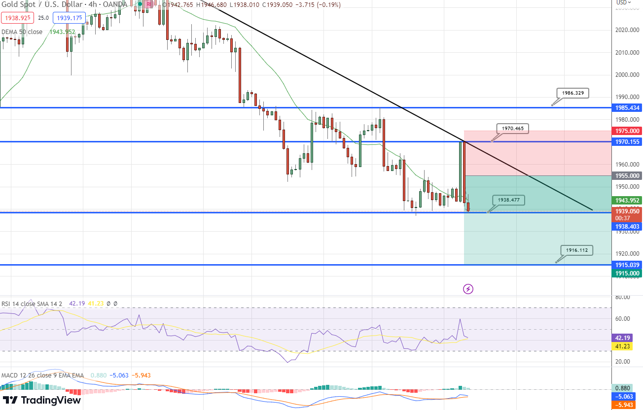 On the other hand, on the four-hour timeframe, there is a downward trend line acting as a major resistance for gold. A successful breakout above this trend line would suggest a potential continuation of the selling pressure below the $1,955 level.