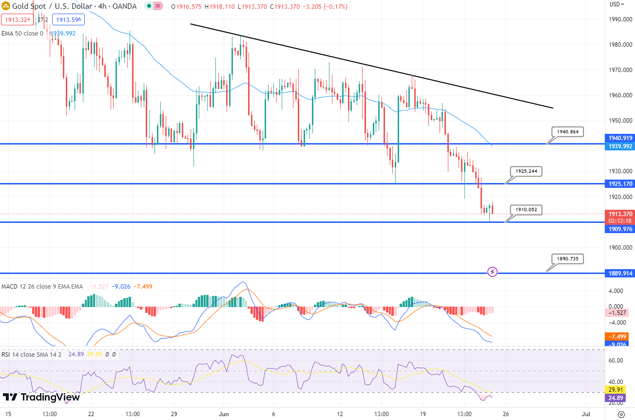- Gold (XAU/USD) begins the day with a touch of negativity, exerting pressure on the $1,913.15 level, indicating a bearish outlook for the intraday and short-term periods. The next key support is expected around $1,873.50.