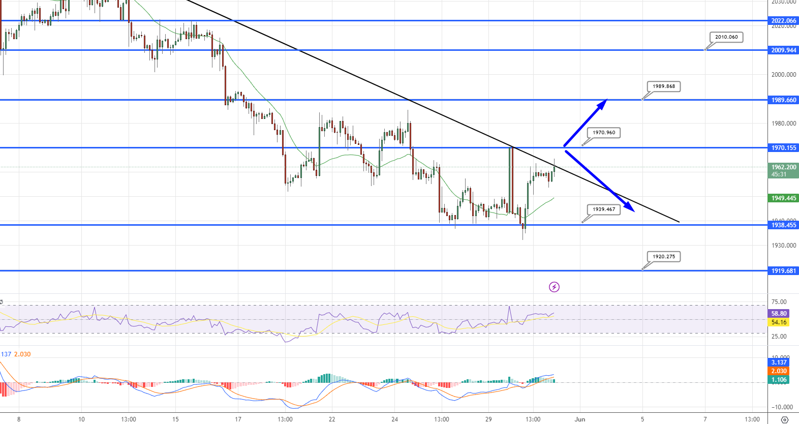 Presently, a downward trendline may pose substantial resistance around the $1965 mark. If gold succeeds in breaching this level, it is likely to encounter the next immediate hurdle at $1971.