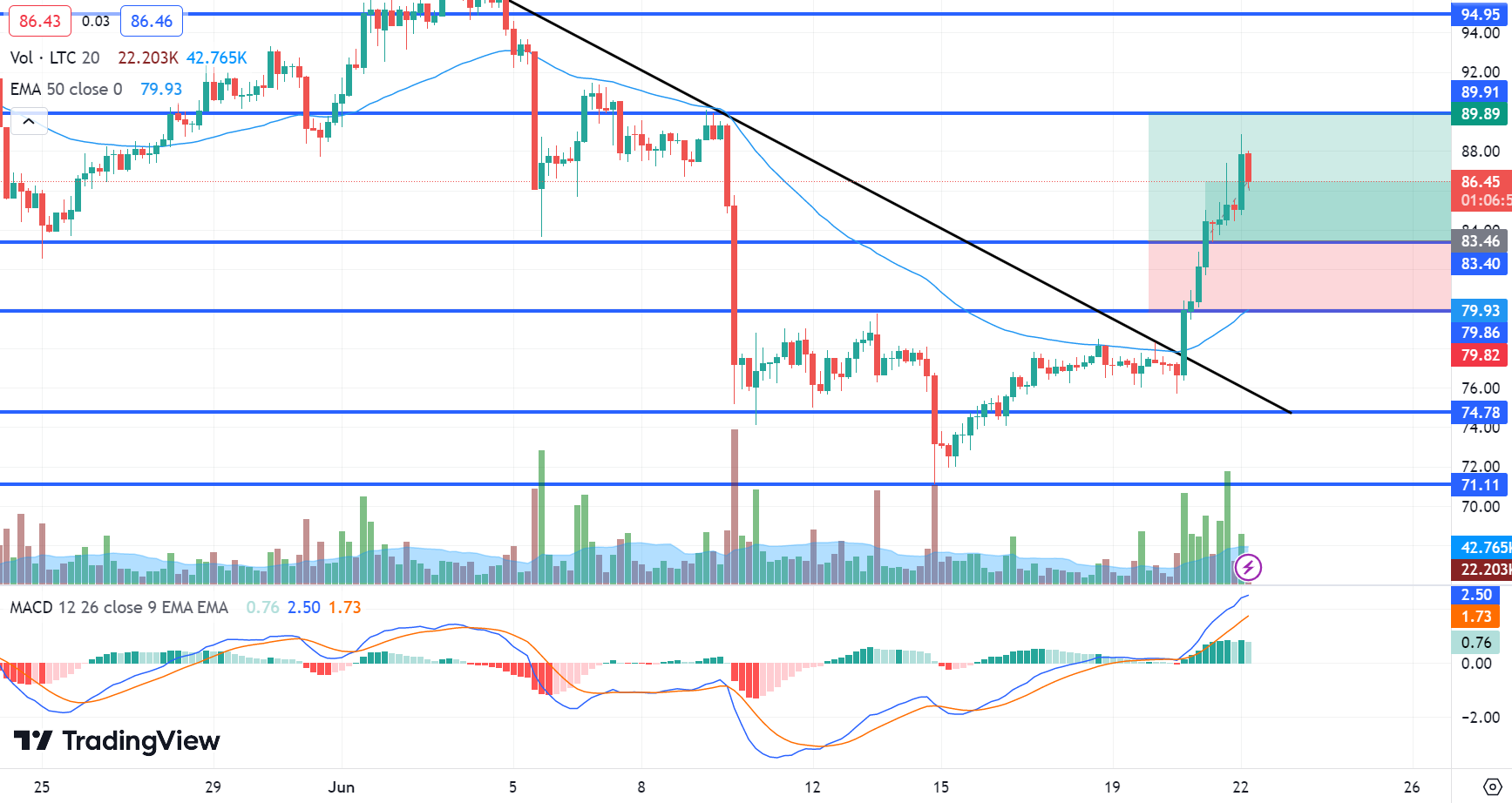 There is speculation that the price of Litecoin could reach $100 in the next six weeks due to the upcoming LTC halving. On August 2, 2023, Litecoin will go through its third halving event, resulting in a reduction of block rewards from 12.5 to 6.25 LTC.