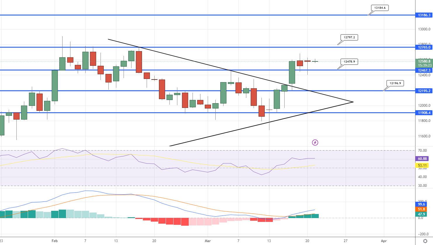 The NASDAQ 100 Index is currently trading at 12,562.61, marking a 0.34% increase in the past 24 hours. Traders have gained confidence in the potential resolution of the banking industry crisis, resulting in higher stock prices.