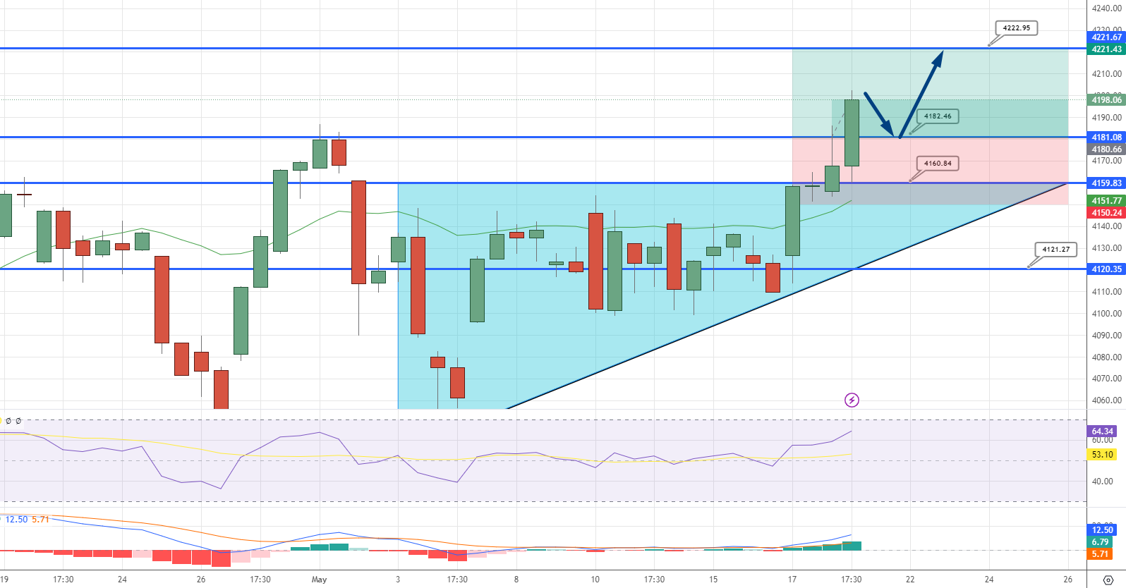 The S&P 500 is currently trading at the 4198 level, aligning closely with our previous forecast of 4190. On the four-hour timeframe, the index has broken through an ascending triangle pattern, indicating a strong resistance level around 4160.
