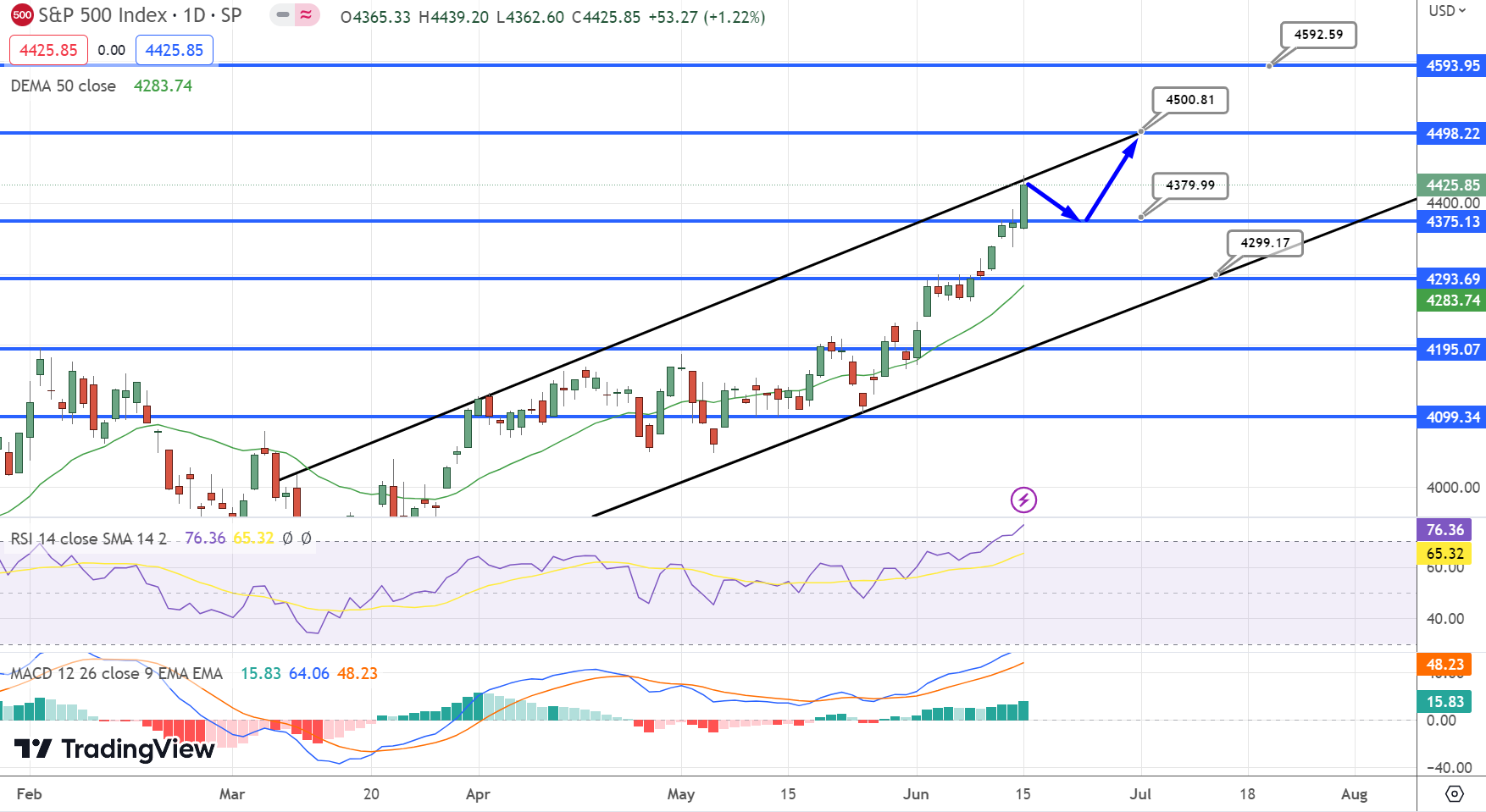 - S&P 500 exhibits strong bullish momentum, surpassing the $4,375 level and currently trading near $4,425.