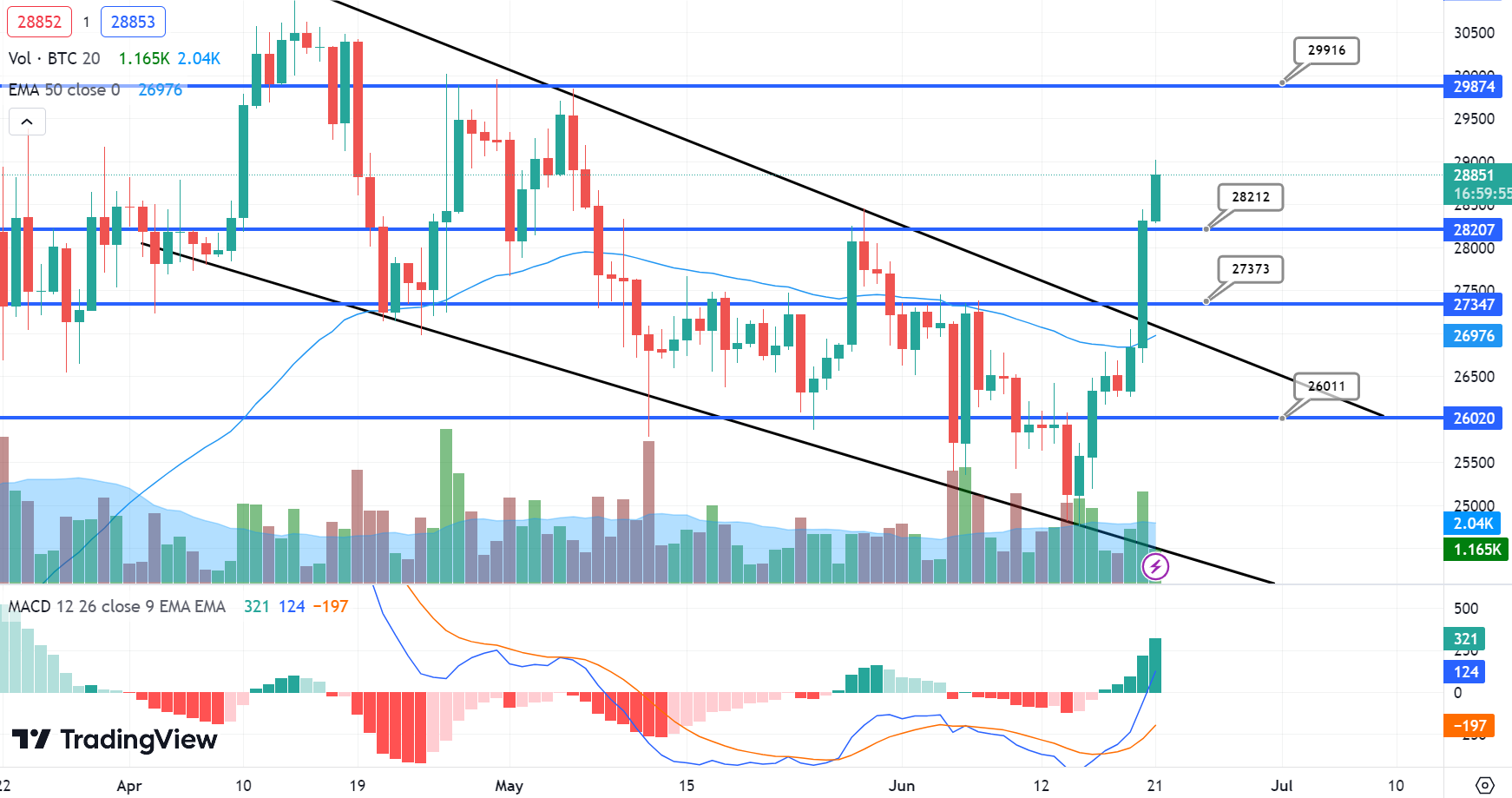 This level holds the key to Bitcoin’s next moves. If it manages to hold above this level, we can expect the bullish momentum to persist and carry Bitcoin towards the remarkable $30,000 milestone.