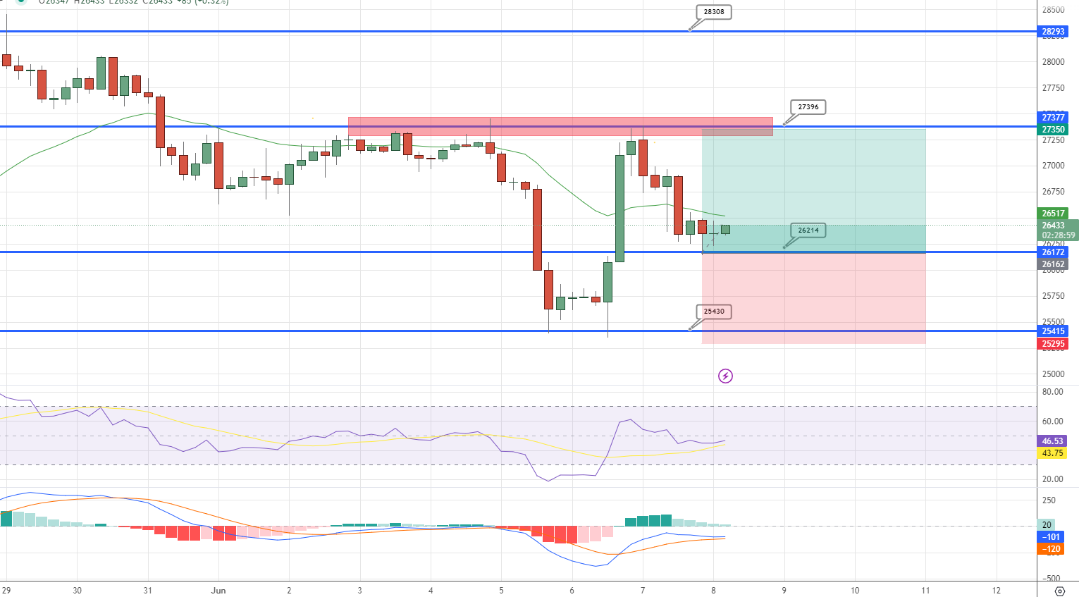 A whimsical tweezer top pattern emerges on the daily timeframe, signaling a possible shift in the bullish vibes and hinting at the potential for a price drop if it stays below the resistance at 26,600.