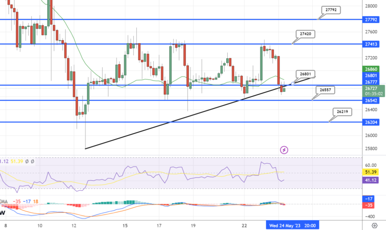 They are in neutral territory when analyzing the RSI and MACD, both leading technical indicators. Bitcoin's price fluctuates above and below the 50-day exponential moving average, indicating mixed sentiment among investors. Thus, today's pivotal point will likely be at the $26,750 level.