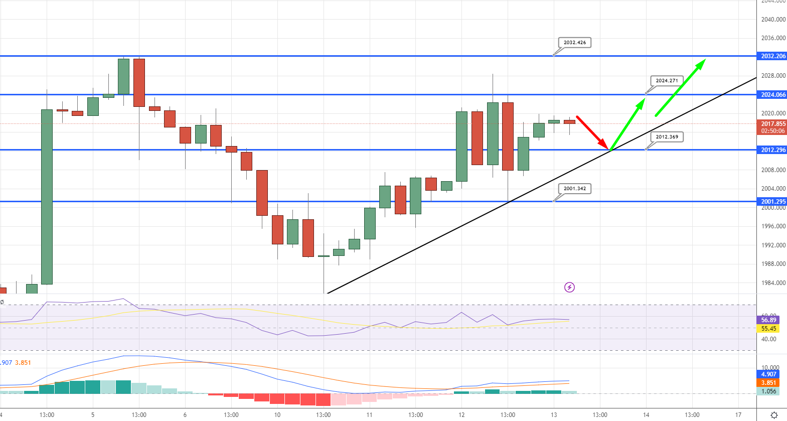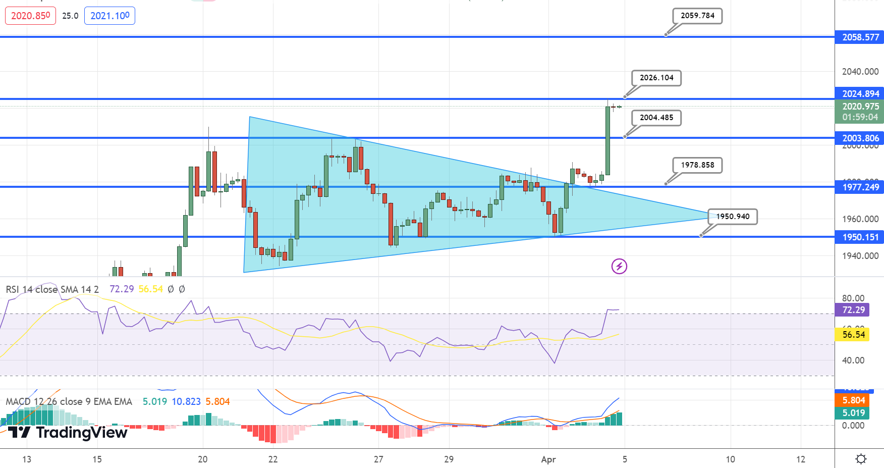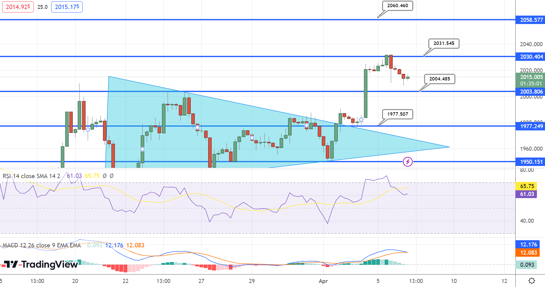 Leading technical indicators such as RSI and MACD are still in a buying zone, with RSI holding above 50 and MACD above 0. Both of these indicators suggest that bulls may dominate the market. Given this, the idea is to look for a buying position above the $2,012 level with a target price of $2,024 and a stop loss around or below $2,005.