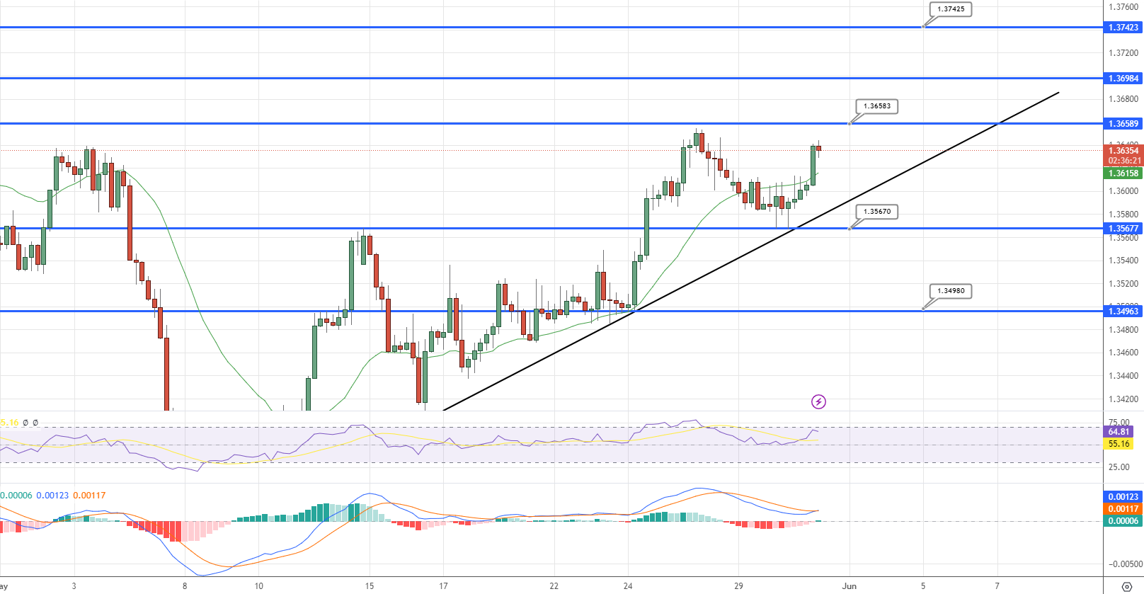 During the Asian trading session, the USD/CAD pair displays a positive inclination, hovering around the 1.3635 mark. A glance at the four-hour chart reveals a surge of bullish activity for the Canadian dollar around the 1.3567 mark.